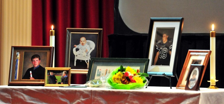 Photos of 22-year-old Justin DeSha-Overcash were placed around the Memorial Chapel during Thursday’s vigil, which was held to commemorate the life of the fifth-year senior who was killed in his off-campus home Jan. 11.