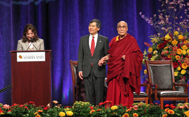 When the Dalai Lama left the Comcast Center yesterday morning, he took with him a piece of paper, a Maryland visor and a small bronze sculpture.