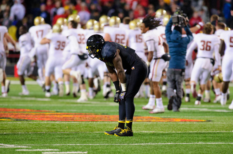 Outside linebacker Marcus Whitfield stands on the turf at Byrd Stadium as Boston College celebrates kicker Nate Freese’s game-winning 52-yard field goal in the Eagles’ 29-26 victory over the Terps on Nov. 23, 2013.