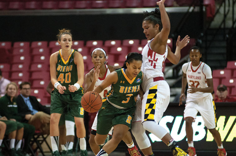 Forward Alyssa Thomas and guard Lexie Brown attempt to block Siena guard Emia Willinghamin the Terps’ 105-49 win over Siena on Dec. 9, 2013.