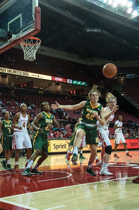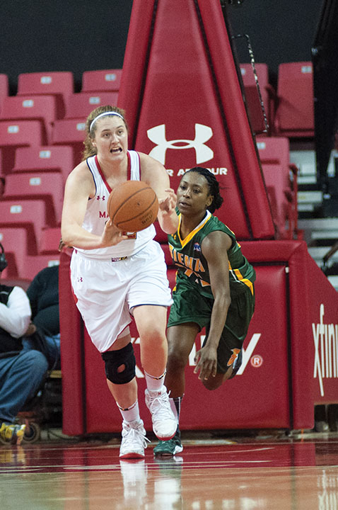 Forward Tierney Pfirman takes a rebound up the court in the Terps’ 105-49 win over Siena on Dec. 9, 2013.