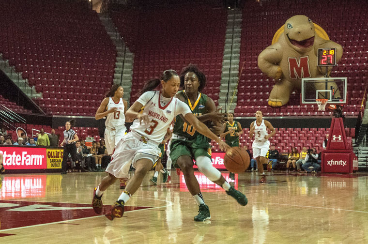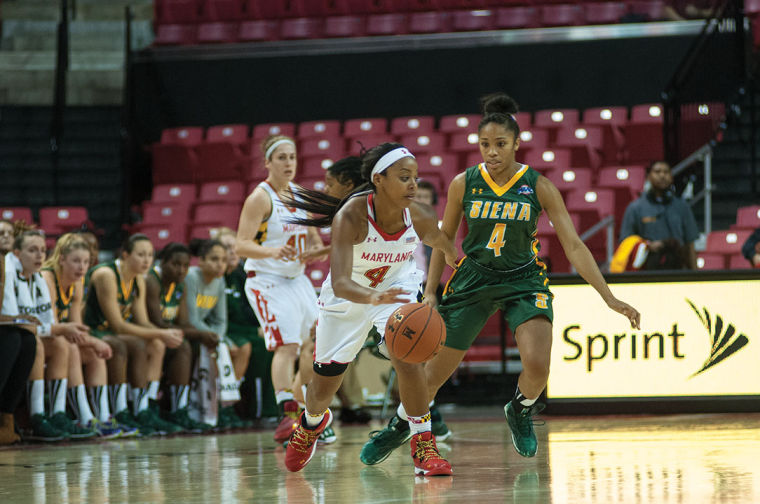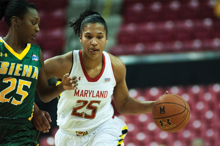 Guard Lexie Brown dribbles around a Siena defender in the Terps’ 105-49 win over Siena on Dec. 9, 2013.