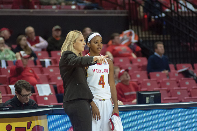 Coach Brenda Frese gives guard Lexie Brown advice in the Terps’ 105-49 win over Siena on Dec. 9, 2013.