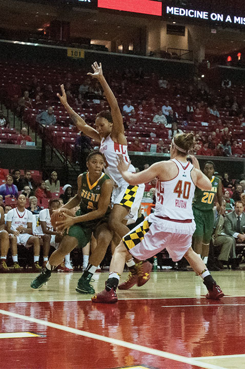 Guard Katie Rutan blocks a Siena player in the Terps’ 105-49 win over Siena on Dec. 9, 2013.