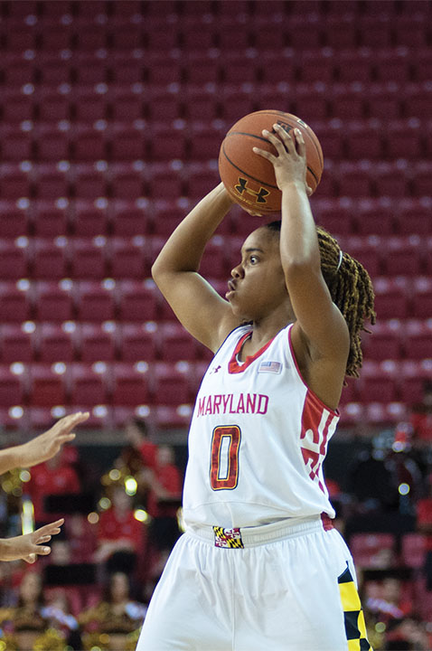 Guard Sequoia Austin looks to pass the ball in the Terps’ 105-49 win over Siena on Dec. 9, 2013.
