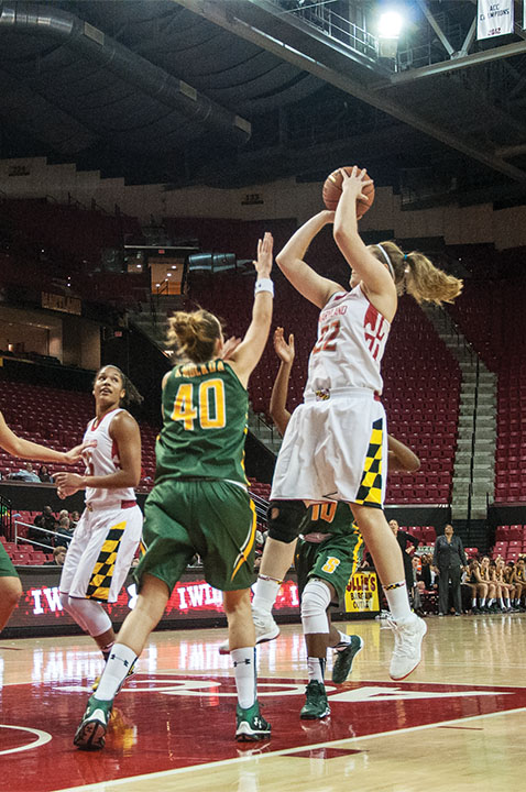Forward Tierney Pfirman jumps to make a shot in the Terps’ 105-49 win over Siena on Dec. 9, 2013.