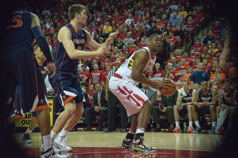 Center Shaquille Cleare dribbles underneath during the Terps’ 75-69 upset of No. 5 Virginia on March 9, 2014 in the final ACC game at Comcast Center.