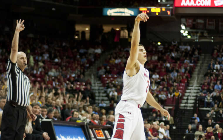 Guard Seth Allen after hitting a three pointer in the first half.