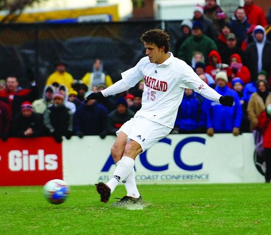 Terp forward Mark Burch strikes the winning kick.