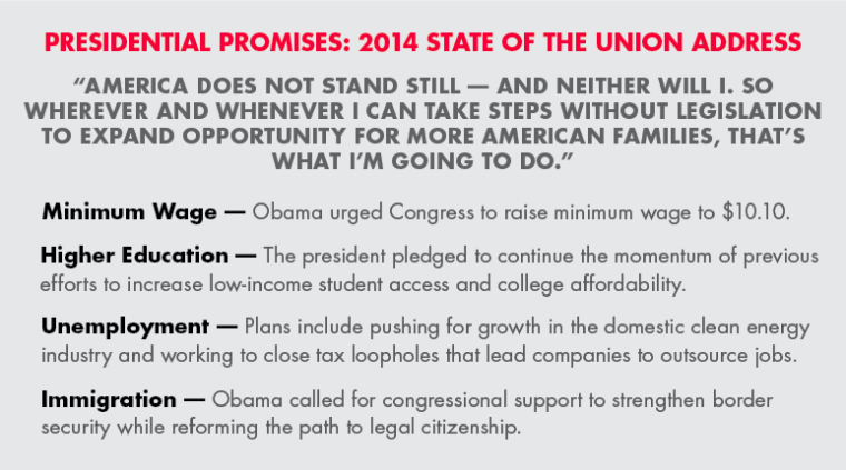 Obama also pushed for an increase in minimum wage. Working off last year’s pledge to increase the national wage floor from $7.25 an hour to $9, he upped the ante this year by supporting a joint bill, sponsored by Sen. Tom Harkin (D-Iowa) and Rep. George Miller (D-Calif.), to raise the minimum wage to $10.10 an hour and by signing an executive order earlier in the day for higher federal service contractor wages. He called on Congress to “give America a raise,” in his speech.