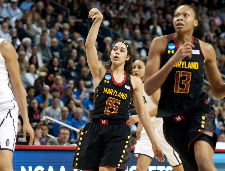 Guard Chloe Pavlech hits a 3-pointer in the first half of the Terps’ 76-50 loss to UConn in the Sweet 16 on March 30, 2013.