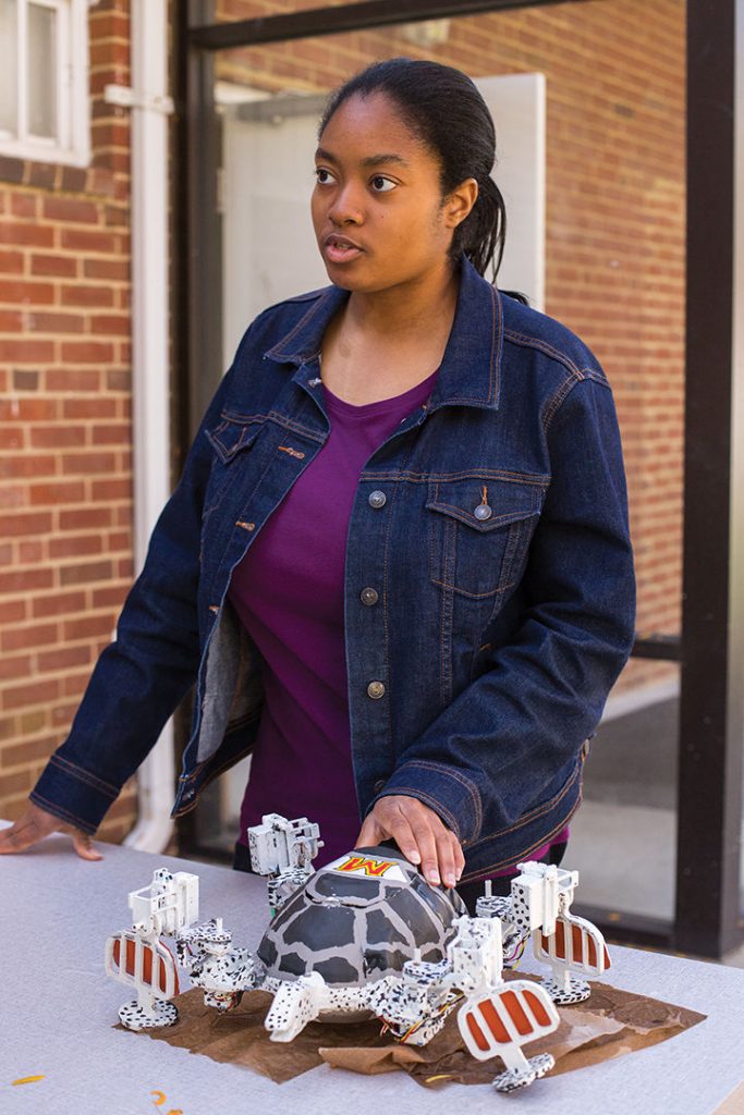 Graduate mechanical engineering student Lena Johnson explains the design of the RoboTerp II, a robot that can be maneuvered through aquatic environments without disturbing the surroundings and wildlife.
