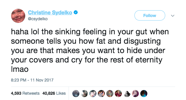 Fat people deserve better in the realm of pop culture, too. Popular comedic content creator Christine Sydelko frequently discusses being the victim of fat-shaming, sometimes taking to YouTube or Twitter to open up about her experiences.