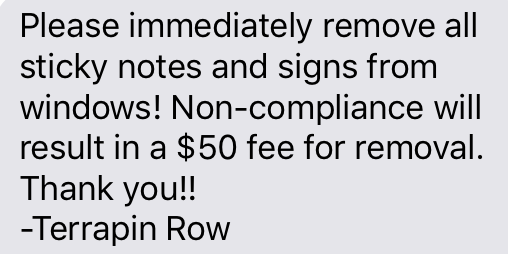 On Friday, I received a message from Terrapin Row saying any students that kept up sticky notes up in their window would incur a $50 removal fee — even though the sticky notes people put up to spell out messages or make art are on the inside of the window and do nothing but good.