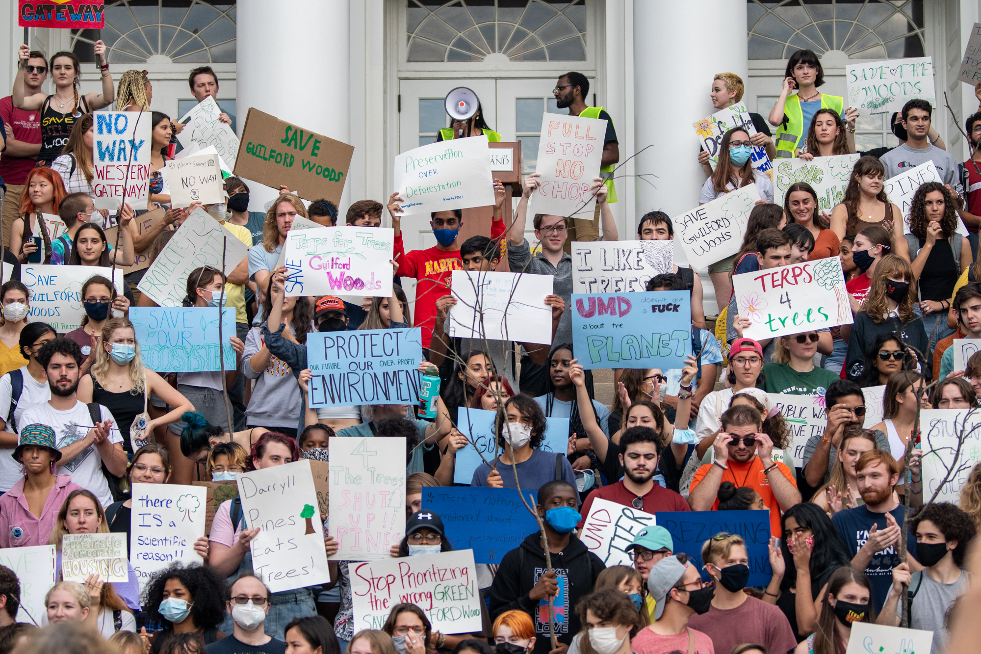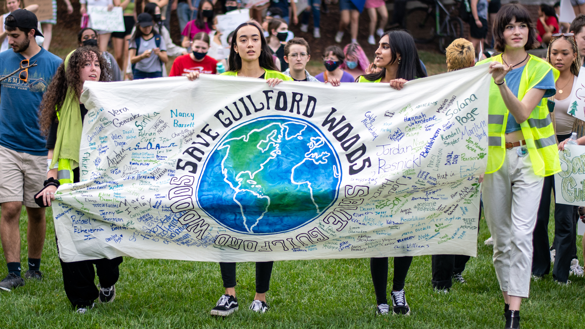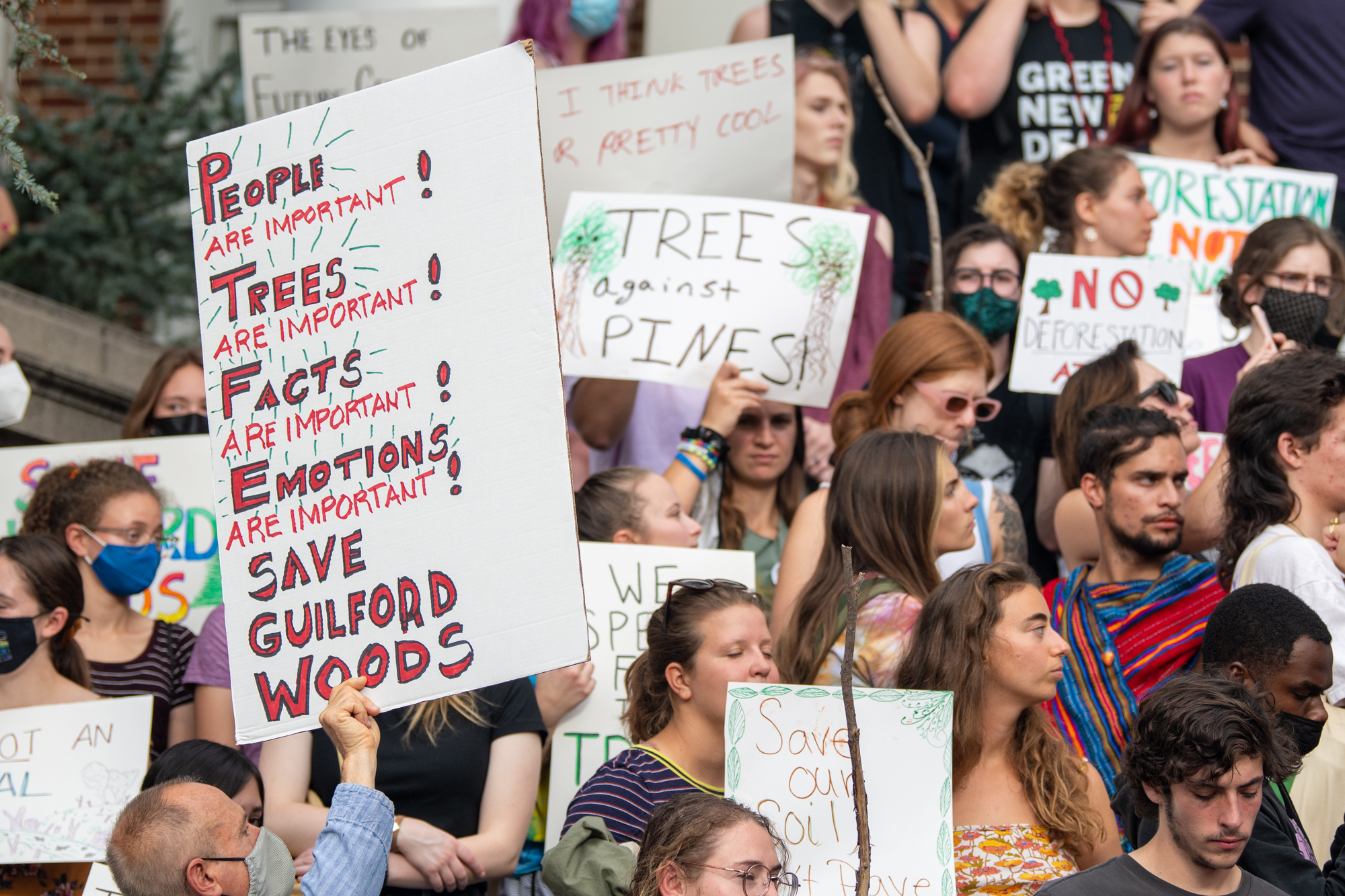 After Pinsky’s speech, attendees marched to the steps of the Main Administration building while shouting “Save Guilford Woods!”