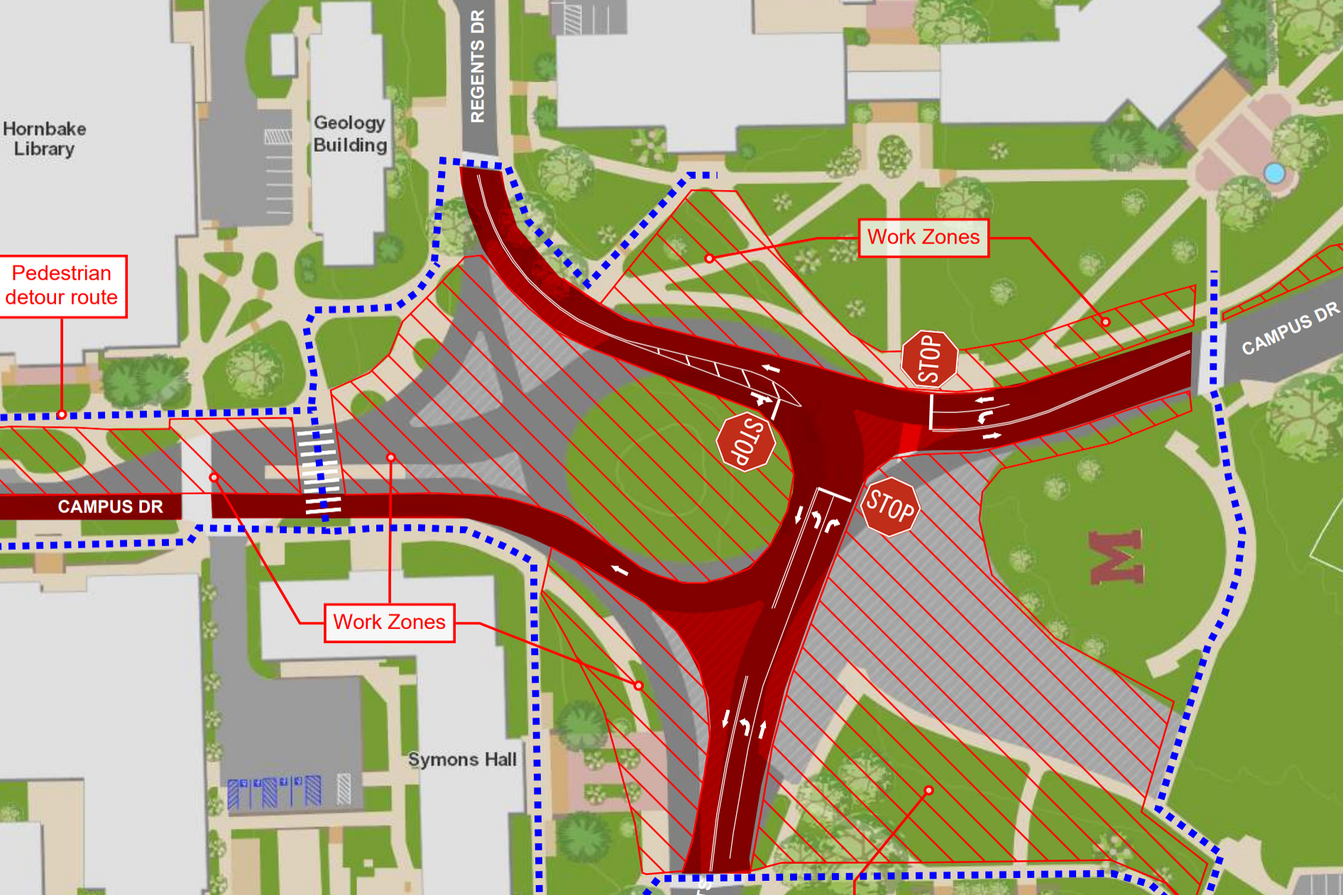 La rotonda en la intersección de Campus y Regents se reconfigurará en una intersección de tres vías. Si conduce por Regents Drive hacia McKeldin Mall, tendrá que girar a la izquierda en Campus Drive antes de salir de nuevo a Regents Drive.