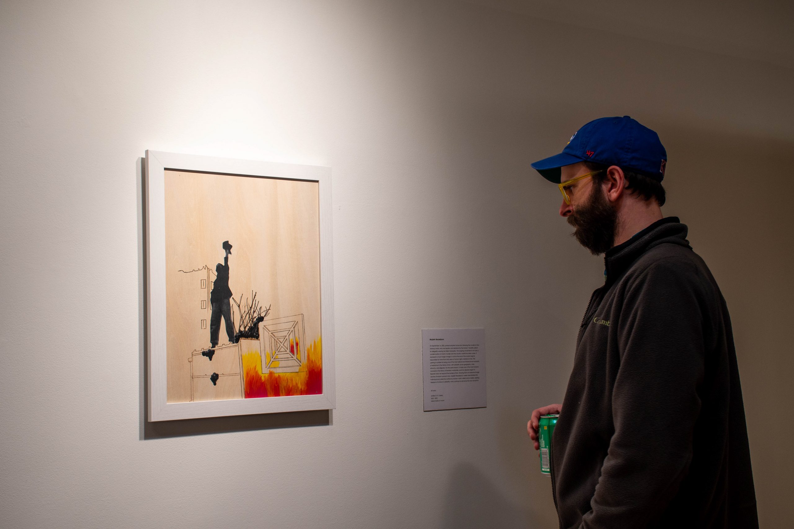 For “UNFOLD,” she painted images of women holding their hijabs off of their heads and existing during the ongoing revolution on wooden canvases.
