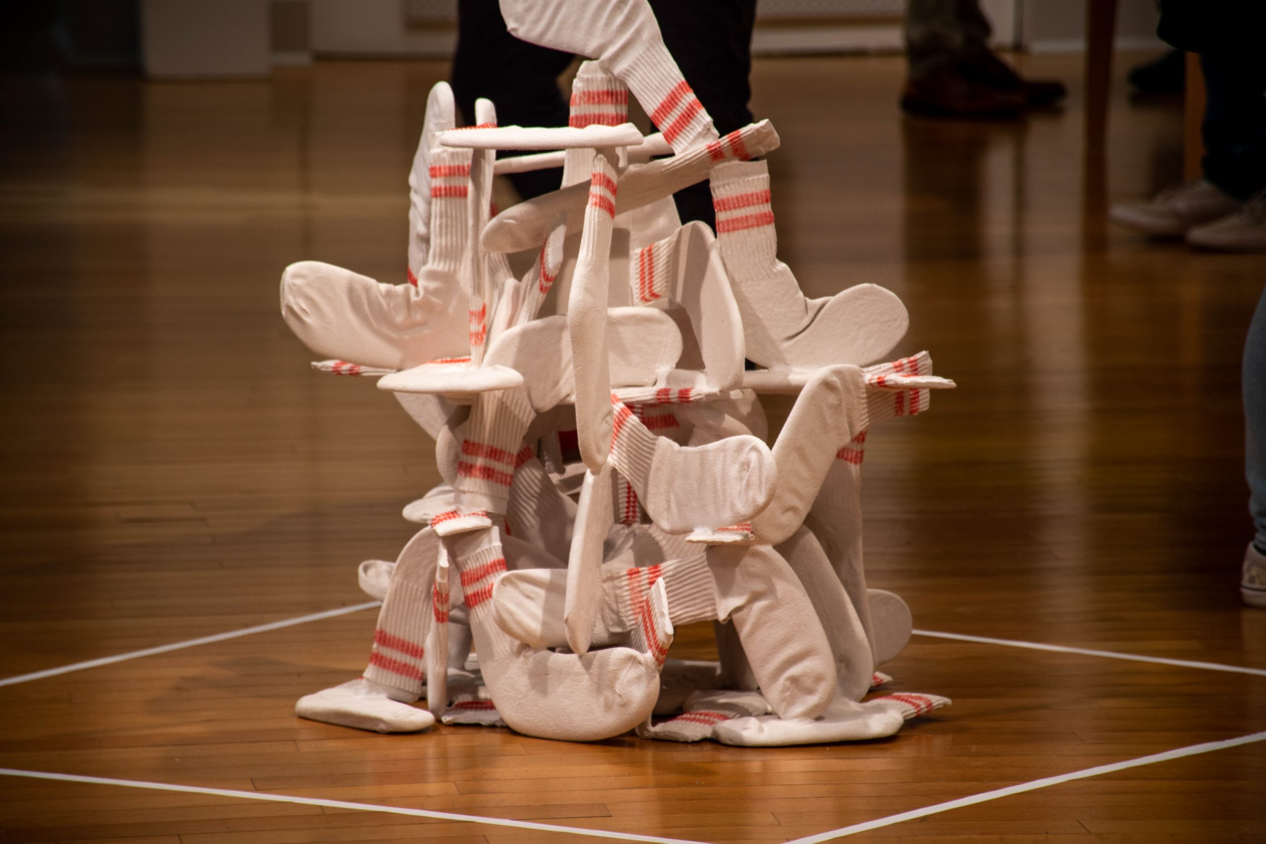 Elliot Doughtie’s work represents gender. His pieces use classic men’s socks, plastered to make them stiff, to represent the failure of fitting into gender norms. Doughtie grew up in Dallas, Texas, surrounded by “macho” culture — he didn’t feel like he fit in.