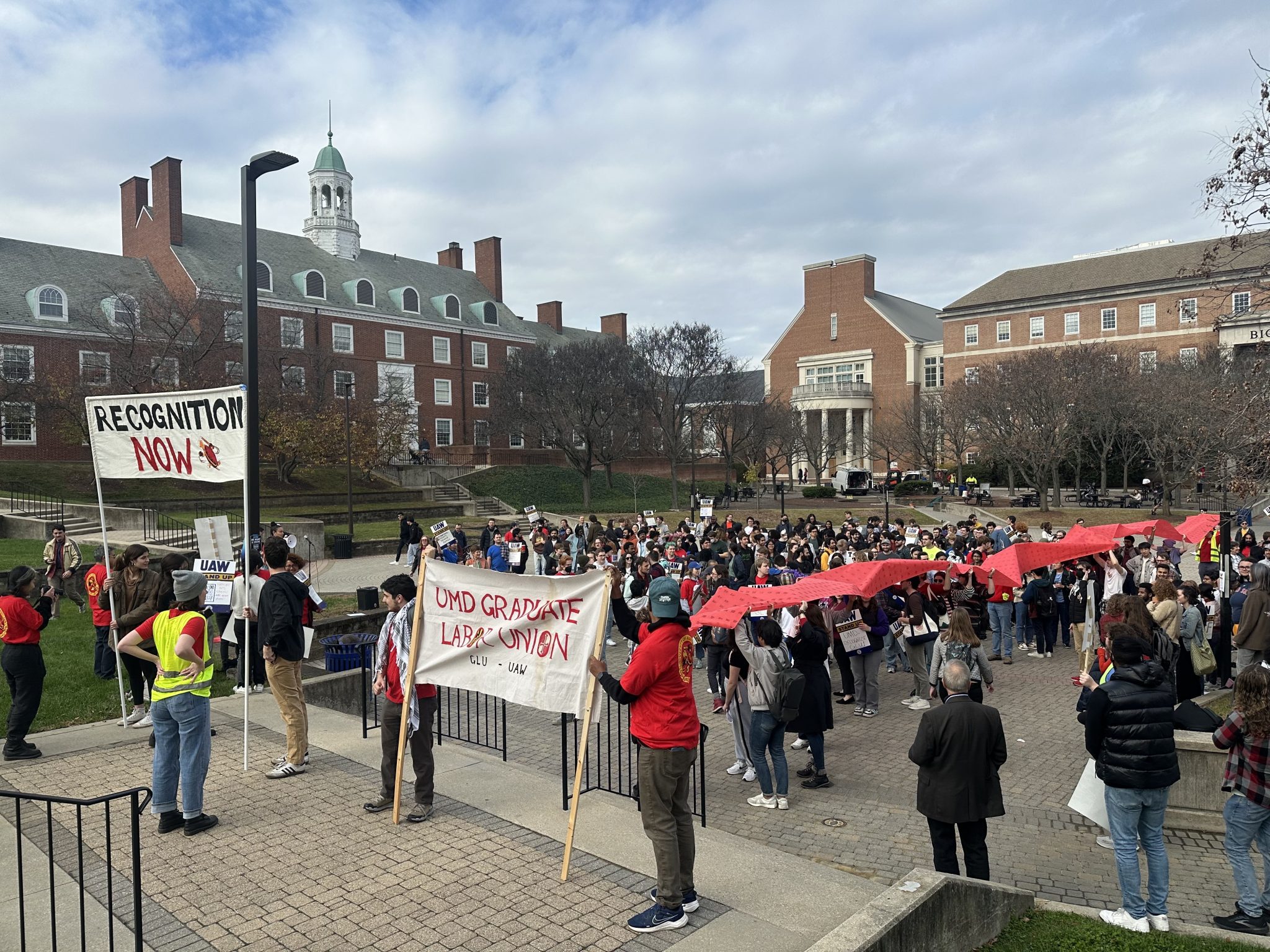 More than 400 University of Maryland community members rallied on Hornbake Plaza Wednesday to urge this university and the University System of Maryland to recognize graduate student workers’ right to unionize.