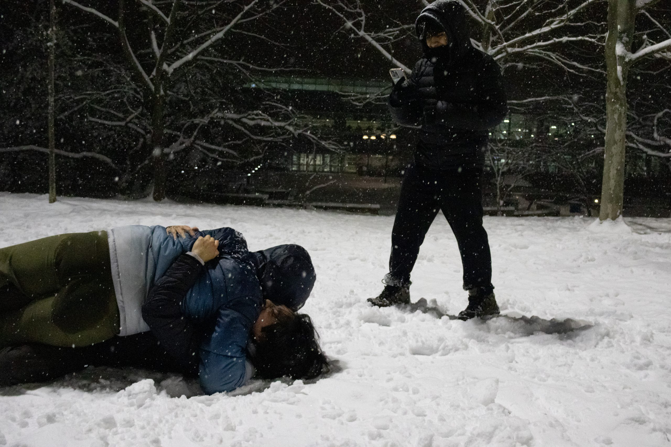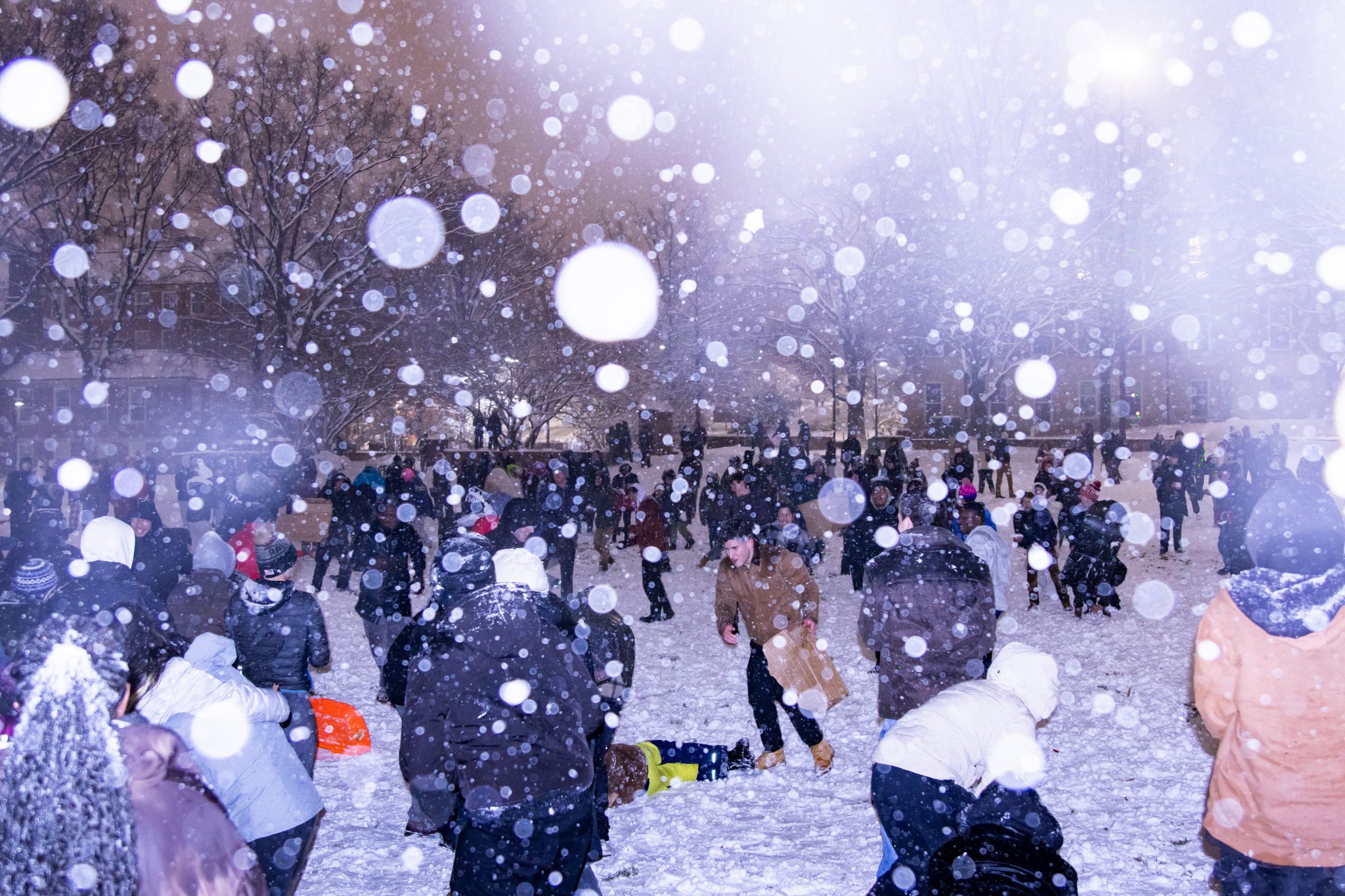 Students gather on McKeldin Mall as snow falls on Feb. 11, 2025. (Neelay Sachdeva/The Diamondback)