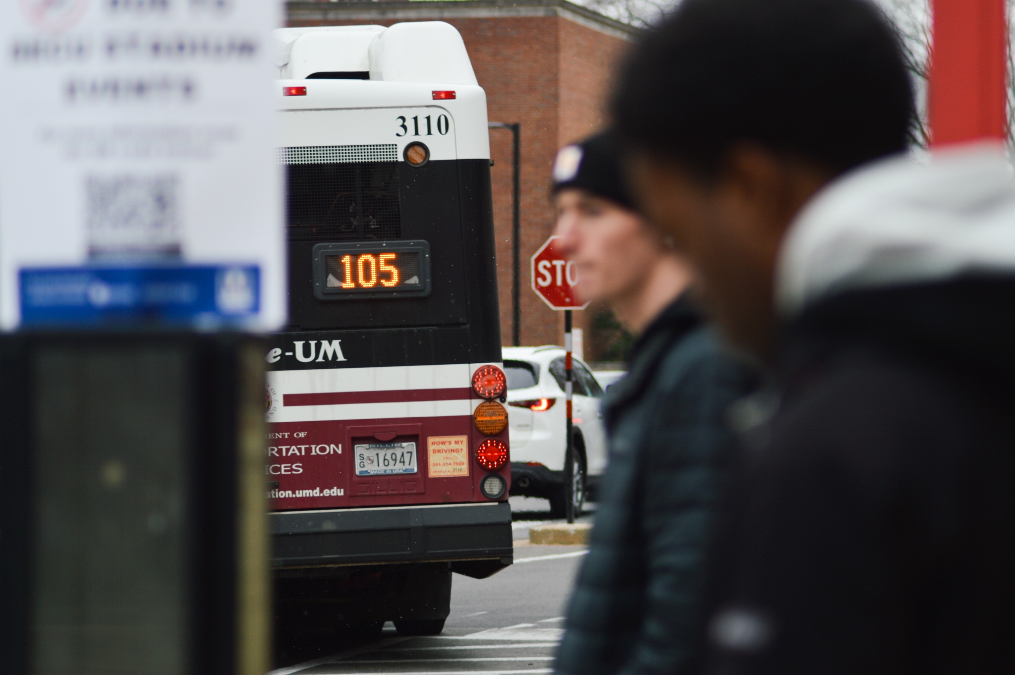 A Shuttle-UM bus departs from the Regents Drive Garage bus stop on Feb. 12, 2025. (Giuseppe LoPiccolo/The Diamondback)
