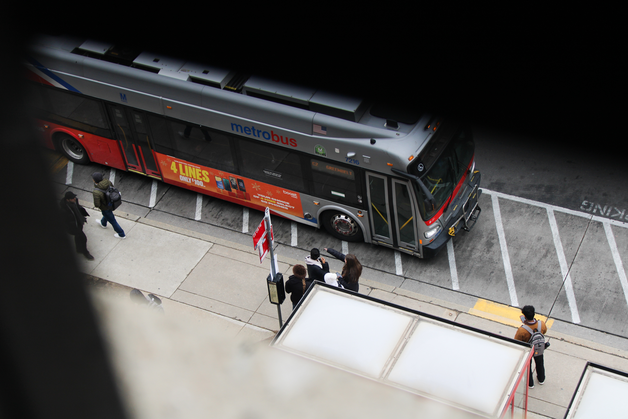 People wait at the Regents Drive Garage bus stop as a Metrobus stops. (Giuseppe LoPiccolo/The Diamondback)