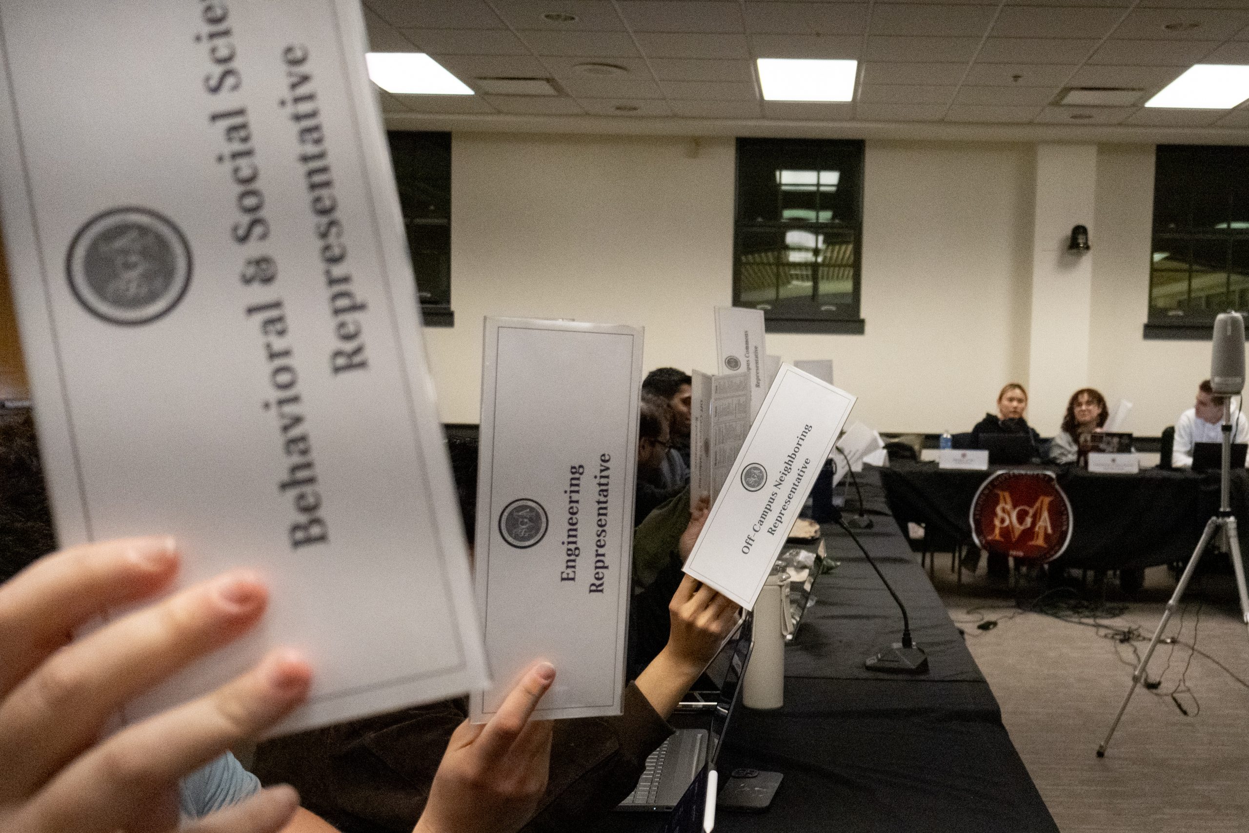 Members of the SGA legislature vote during a general body meeting on Feb. 19, 2025. (Clare Roth/The Diamondback)