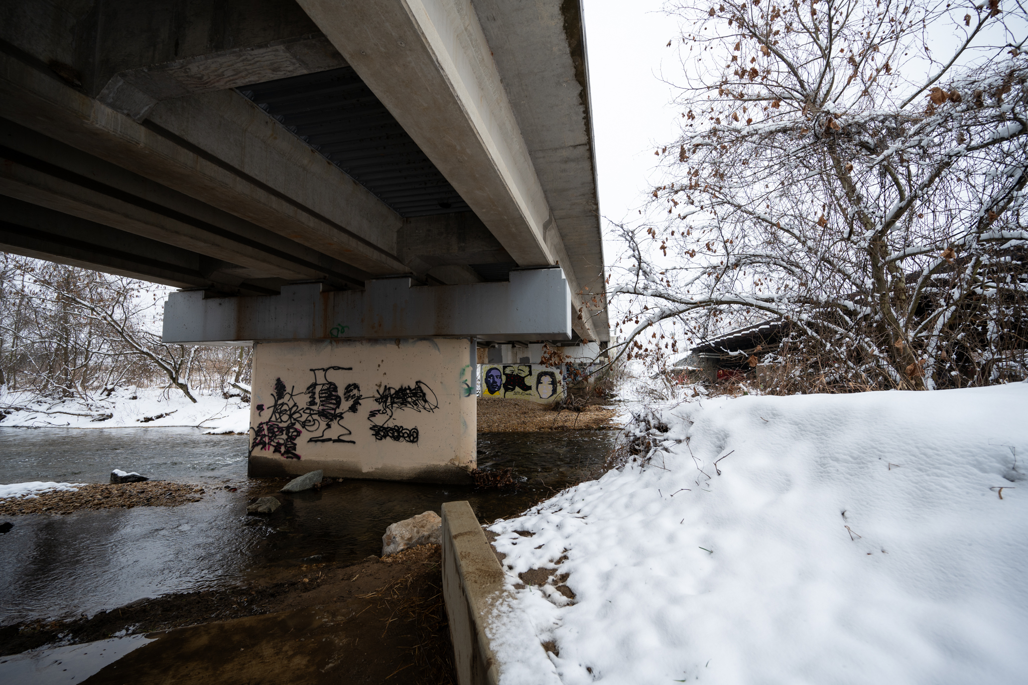 Graffiti on display under Metro tracks by Lake Artemesia on Feb. 12, 2025. (Ryan Bowie/The Diamondback)