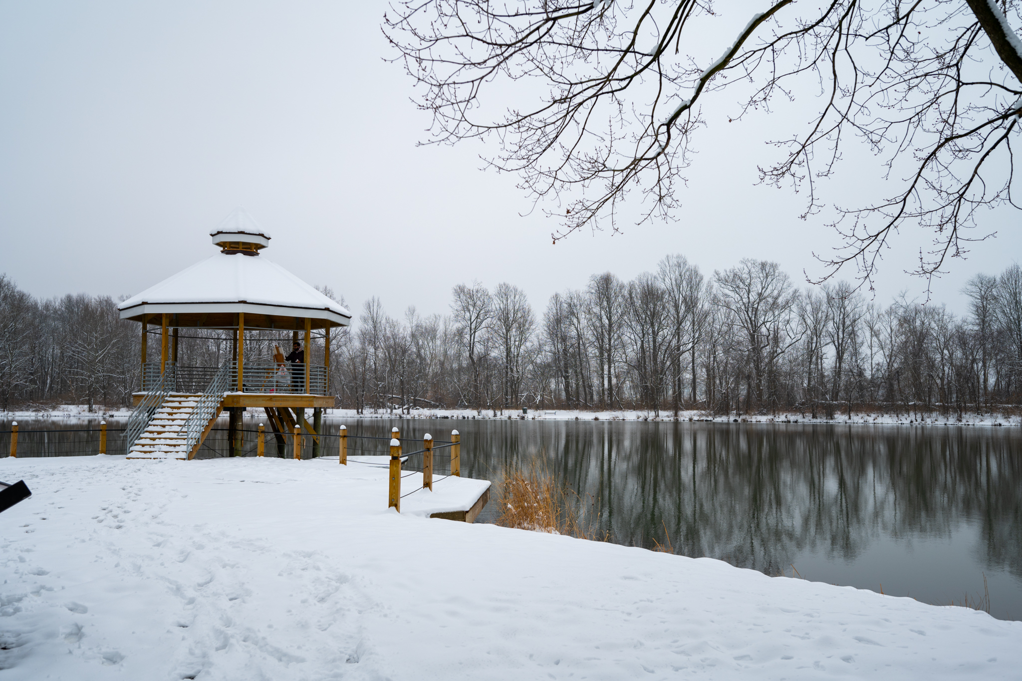 University of Maryland student Neal Machado paints while standing at a gazebo at Lake Artemesia on Feb. 12, 2025. (Ryan Bowie/The Diamondback)