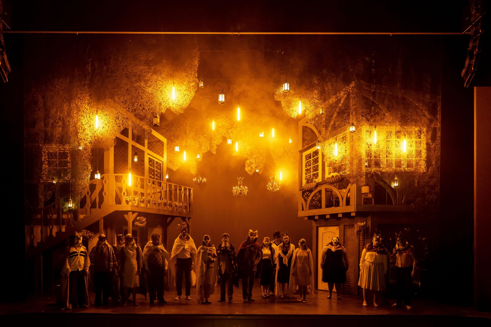 The set design mainly stays true to its roots, but integrates alluring lighting techniques, including a sea of floating lanterns and forest chandeliers seemingly suspended midair.