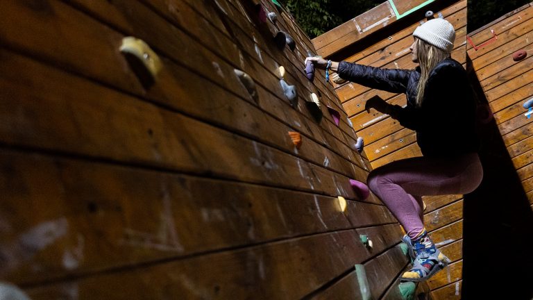 Before the ascent: UMD students set routes at the Eppley climbing wall The routes are made with different plastic shapes of different colors. Ryan White October 4, 2021