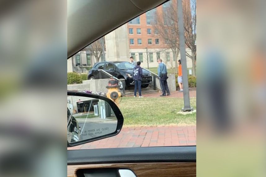 A UMD student had the fearless idea to drive down stairs near Van Munching The student got his car stuck. Samantha Subin March 26, 2019