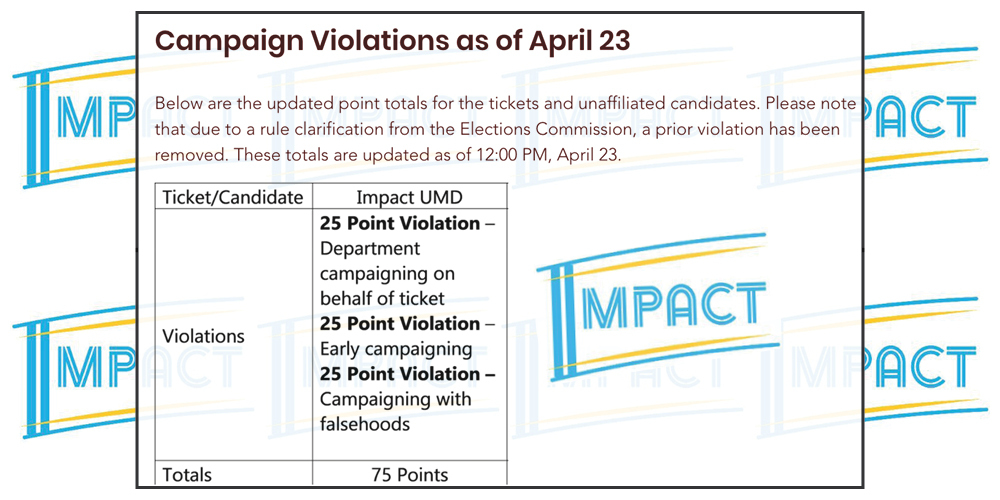 ImpactUMD party is one campaign violation away from SGA election disqualification The party is currently appealing their third violation. Kanika Mehra April 24, 2020