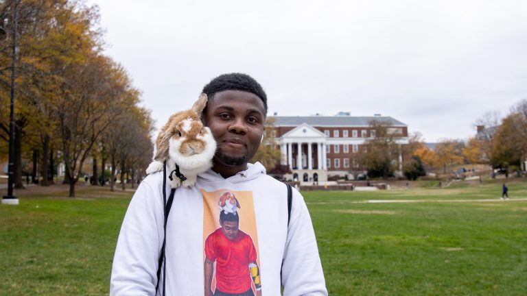 Samuel Booker IV adopted Butterscotch from a Virginia farm in 2020. He’s been bringing the bunny to campus ever since.